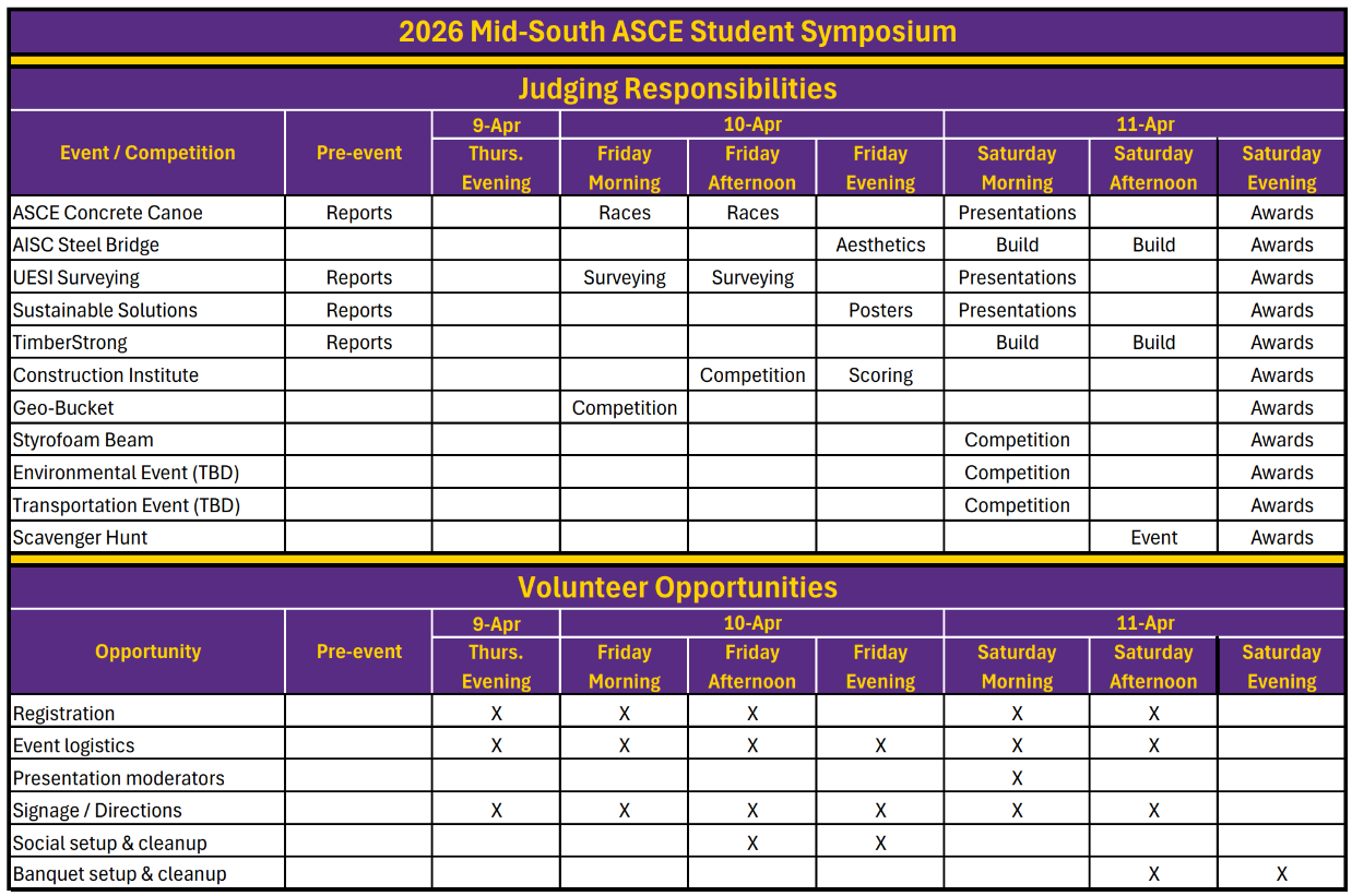 We are seeking judges and volunteers to help with all aspects of the symposium. The tentative schedule and our current needs are detailed below. Click the Volunteer button and scroll to the bottom of ASCE’s volunteer page to let us know you are interested. Alternatively, email us at [email protected].