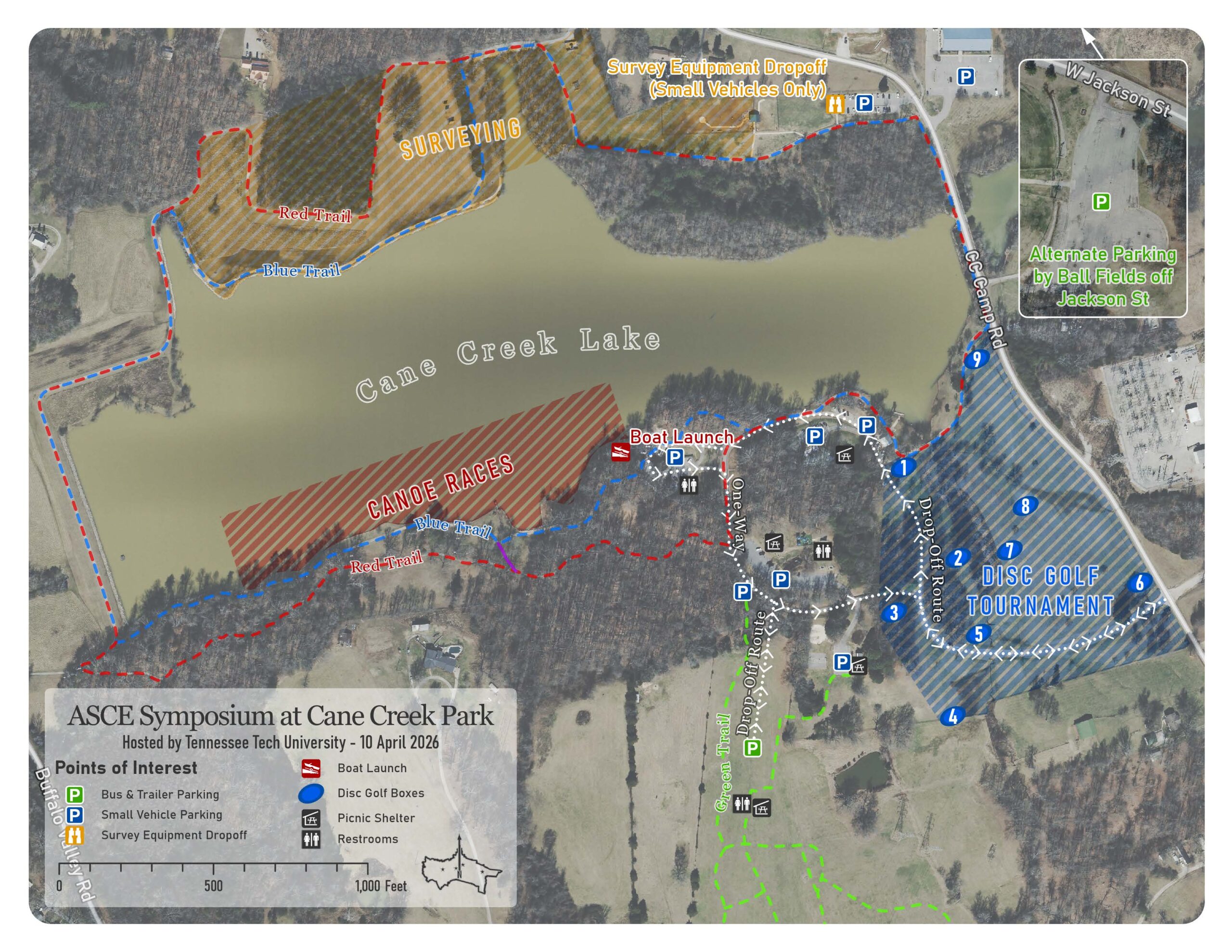 The map below shows the competition areas for the Concrete Canoe, UESI Surveying, GeoBucket, and Frisbee Golf competitions at Cane Creek Park on April 10, 2026. Click here to download image file.